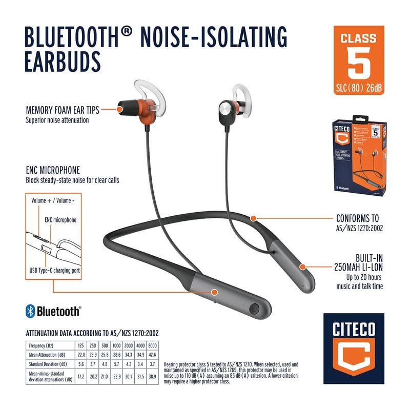 Unlike traditional hearing protection, Citeco Bluetooth Noise-isolating Earbuds utilises latest technology and lightweight design concept, you're now free to enjoy a safe, convenient, good quality audio and communication experience while you work.